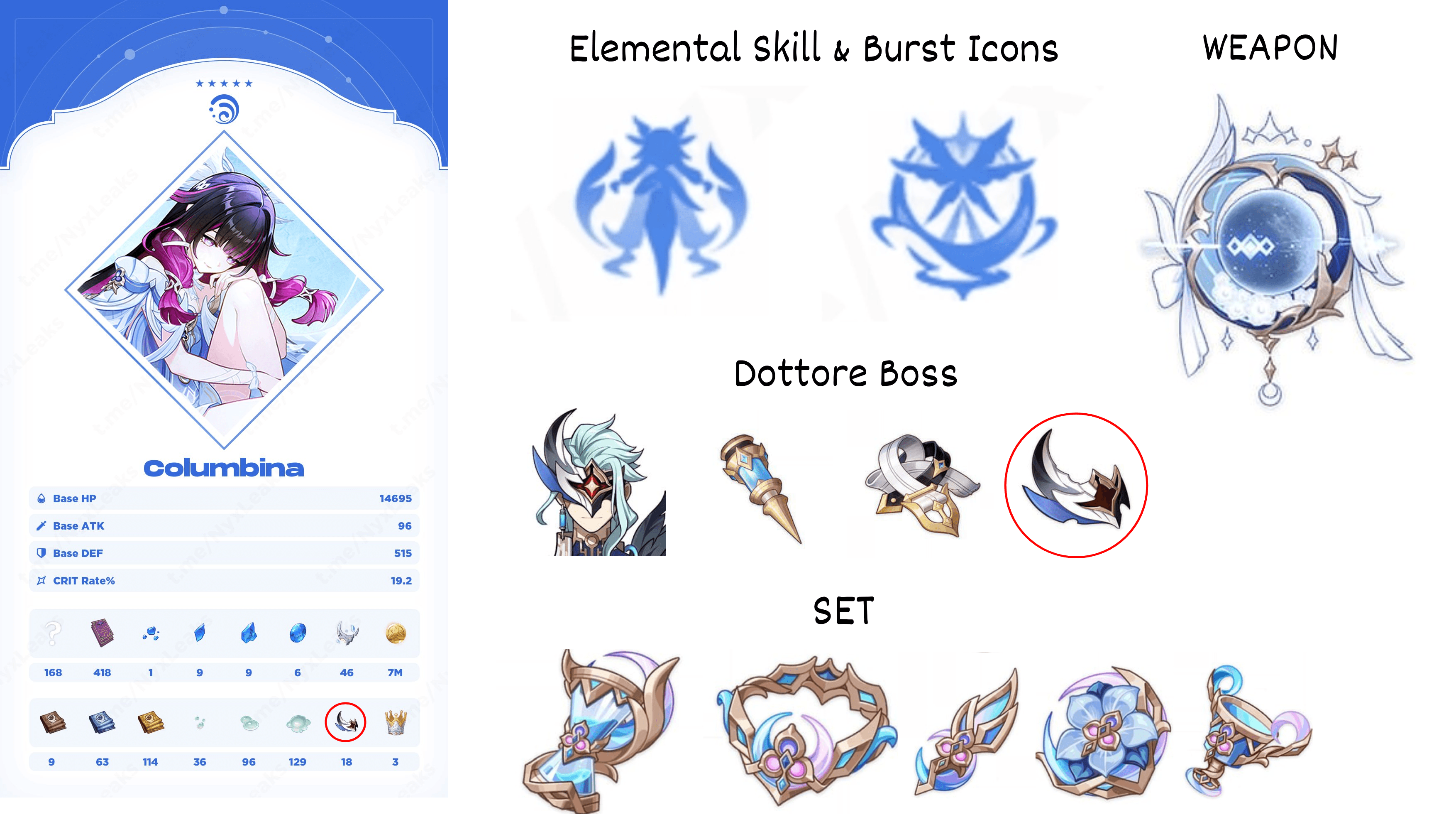 El parche introduce un nuevo jefe semanal vinculado a Dottore. Este jefe suelta materiales avanzados necesarios para ascender a Columbina y su arma distintiva. Esto posiciona a Dottore como central en el ciclo de mejora para los personajes de la versión 6.3.
