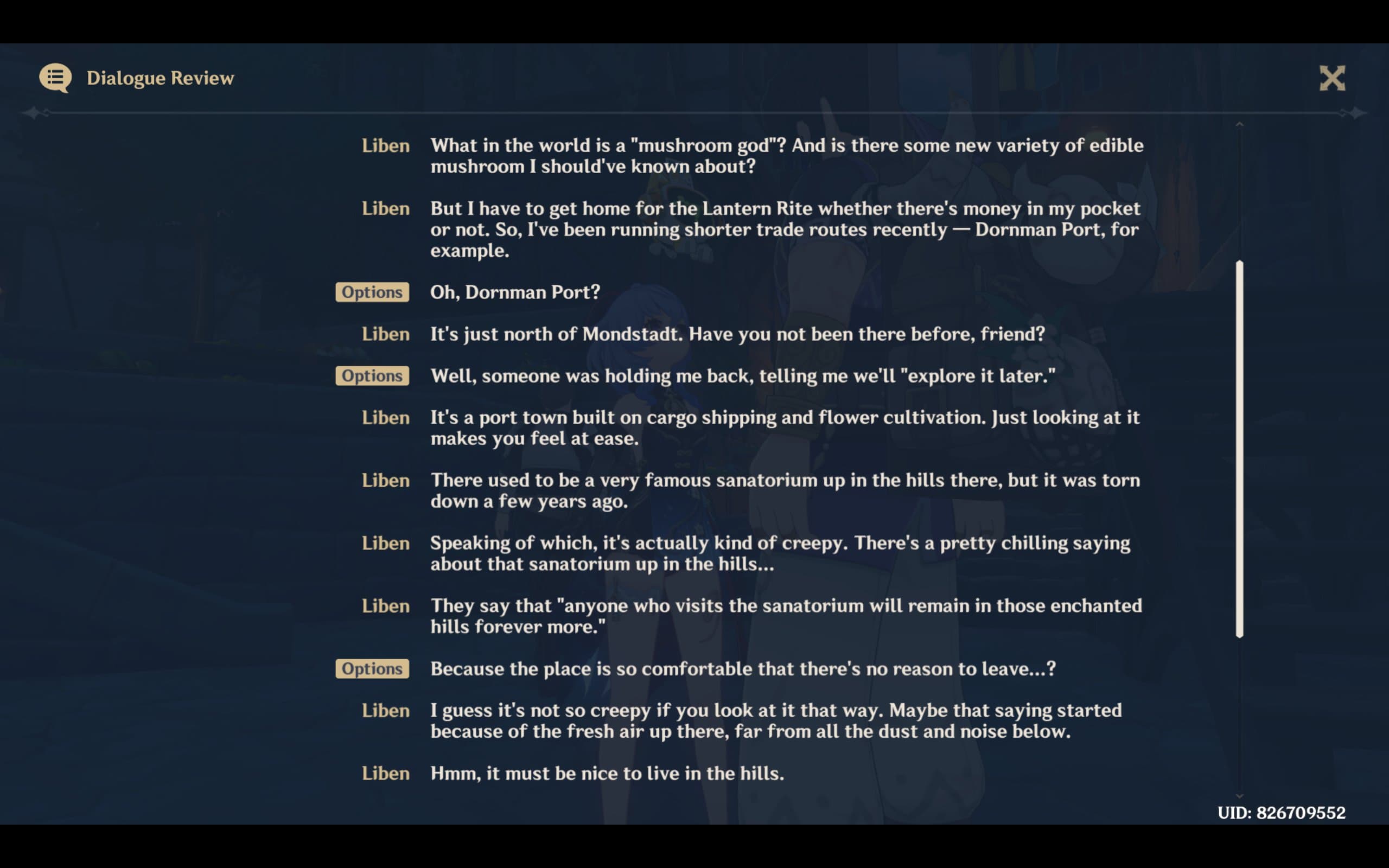 Una de las partes más intrigantes del diálogo surge cuando Liben menciona que solía haber un sanatorio muy famoso en las colinas cerca del Puerto Dornman, que fue derribado hace años. Añade que la ubicación está asociada con un dicho escalofriante. Según los rumores locales, cualquiera que visite el sanatorio permanecerá en esas colinas encantadas para siempre. Aunque Liben minimiza lo espeluznante sugiriendo que la frase podría simplemente referirse al aire limpio y la tranquilidad de la zona, la redacción implica fuertemente una historia sin resolver.