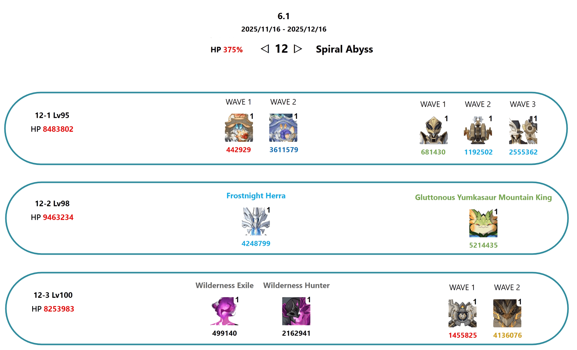 La alineación de enemigos para 12.1, 12.2 y 12.3 incluye a Herra la Caballera de Escarcha, Exiliado del Desierto, Cazador del Desierto y el Rey de la Montaña Yumkausaur Glotón. La distribución obliga a los jugadores a preparar tanto un fuerte daño explosivo de un solo objetivo como un control de masas de área amplia. Varios oponentes aparecen en encuentros de múltiples oleadas que requieren una generación de energía estable y una sincronización precisa de la rotación. Las cámaras posteriores muestran valores de HP extremadamente altos, lo que hace que la escala de daño por reacción y la sinergia del equipo sean más importantes que nunca. Comprender las resistencias de los enemigos, los tiempos de aparición y los patrones de ataque ayudará a los jugadores a maximizar los beneficios de los modificadores de Florecimiento y Piro.