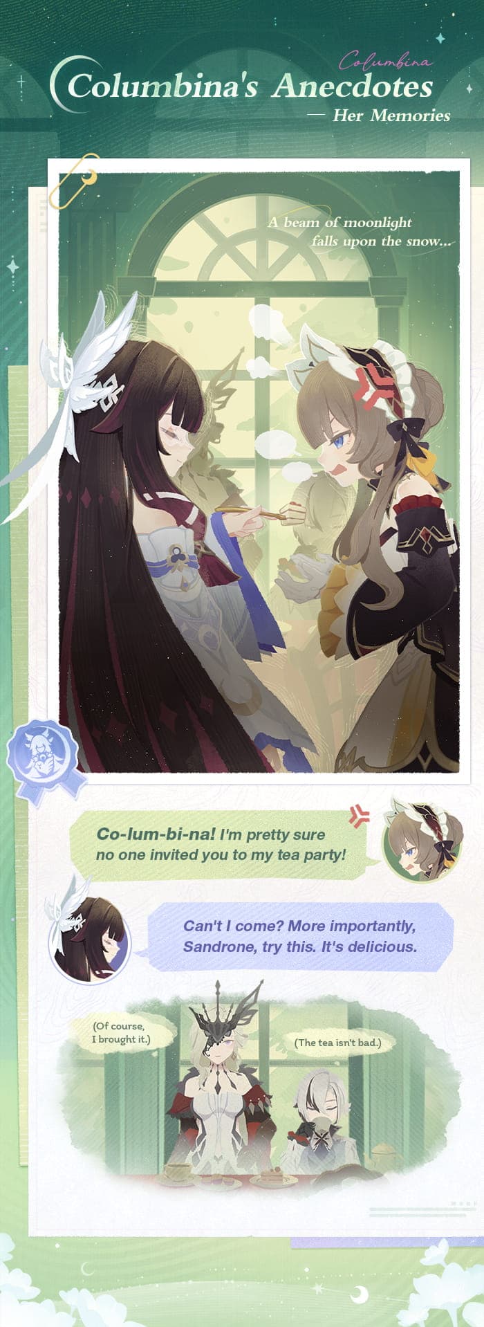 Sin embargo, a medida que crecía y se encontraba con otros, ya fuera durante su tiempo con los Vástagos de la Luna Gélida, su posterior servicio con los Fatui o las amistades que desarrolló después, Columbina fue construyendo lentamente su comprensión de la dinámica social. Cada interacción, recuerdo y respuesta emocional se convirtió en parte del tapiz que le enseñó que las relaciones requieren esfuerzo, vulnerabilidad y la voluntad de ser vista. Lo que comenzó como un difícil proceso de aprendizaje se convirtió finalmente en una parte inestimable de quién es, moldeándola en alguien capaz de empatía y conexión a pesar de una historia de soledad.