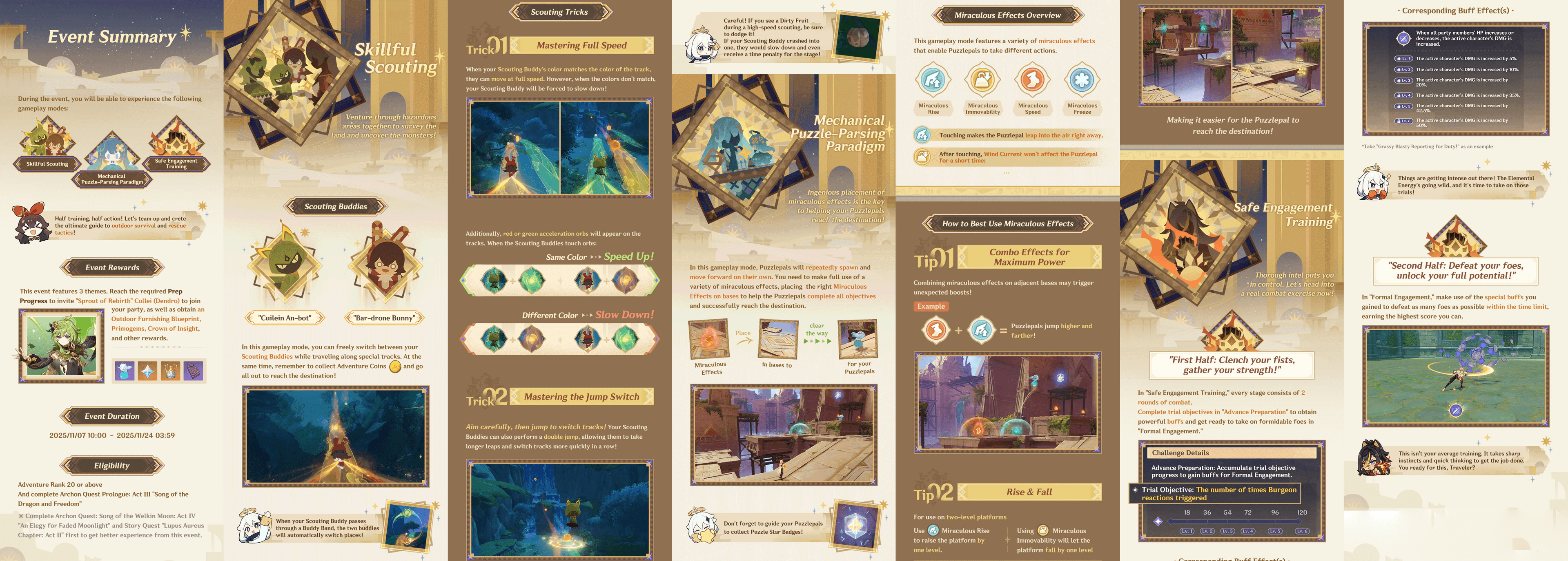 El evento “Exploración de Ruinas” se dividirá en múltiples etapas que se lanzarán a lo largo de su duración. Cada fase introduce nuevas mecánicas, desde campos de resonancia elemental que alteran el flujo del combate, hasta pruebas de exploración cronometradas que requieren resolución de acertijos y eficiencia en el combate. Los jugadores también se enfrentarán a una variedad de enemigos de Ruinas Élite y Autómatas del Desierto, mezclando el combate con el desplazamiento y la interacción ambiental.