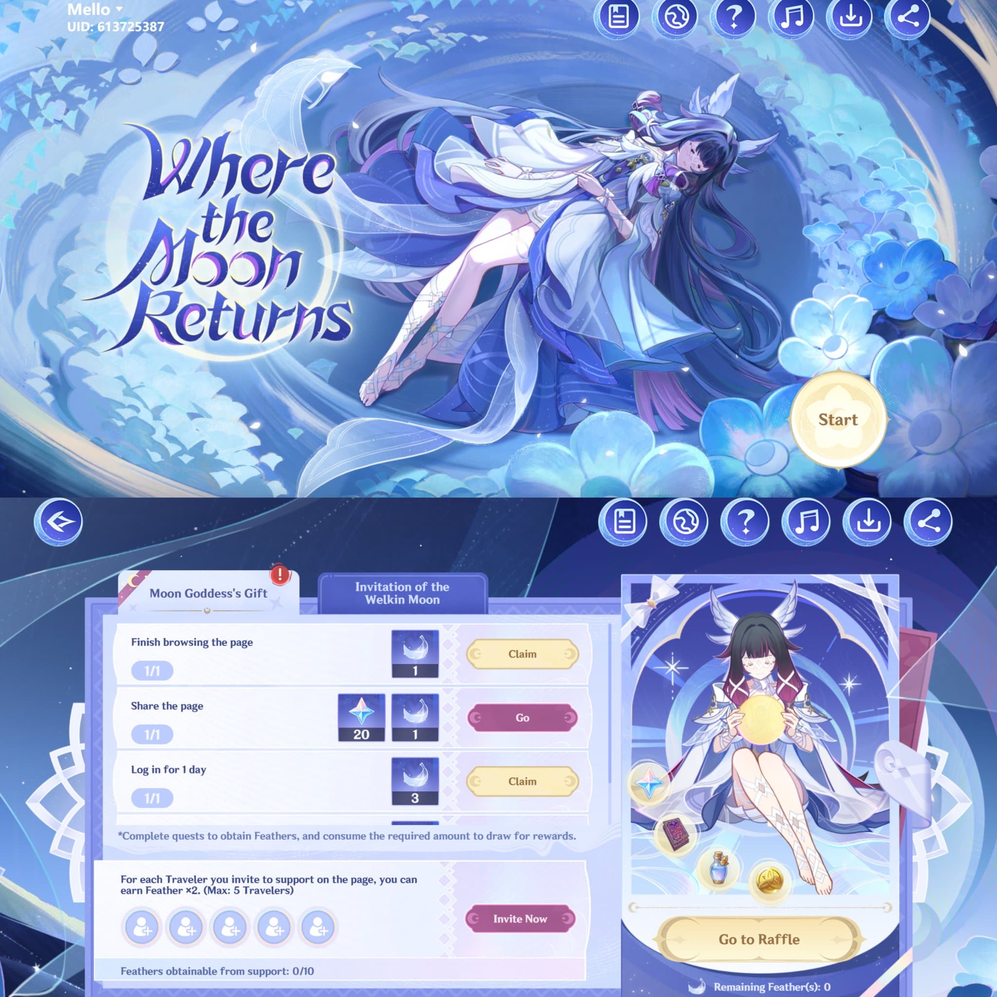 La segunda actividad principal, Invitación de la Luna Welkin, ofrece aún más oportunidades para recolectar Plumas, que actúan como la moneda principal del evento. A través de esta actividad, los jugadores pueden ganar hasta 15 Plumas durante el período del evento. Además, los Viajeros que regresan que se vinculen con otro jugador usando un enlace de invitación por primera vez recibirán recompensas adicionales, incluyendo Protogemas ×20 y Pluma ×2. Esta función está dirigida específicamente a alentar a los jugadores inactivos a regresar y reconectarse con el juego.