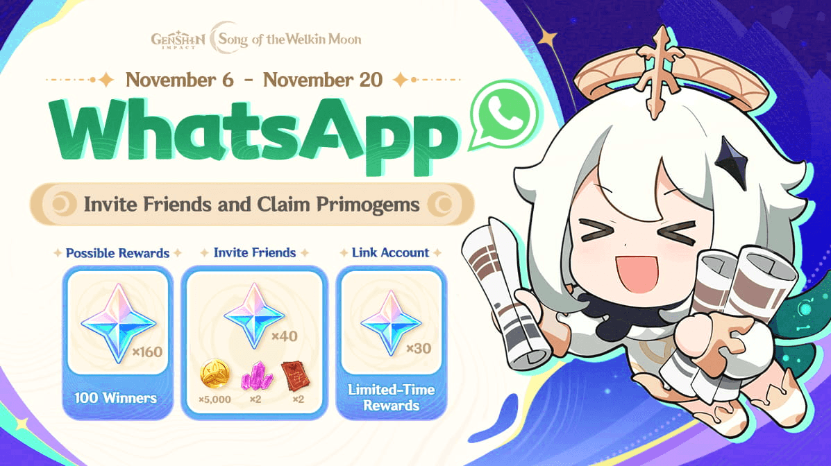 Cada participante también puede reclamar una recompensa extra de Protogemas (×30) vinculando su UID del juego a través de un breve cuestionario accesible a través del chat de WhatsApp. Esta vinculación de UID asegura la entrega adecuada de la recompensa directamente a la cuenta de juego correspondiente después del período del evento.