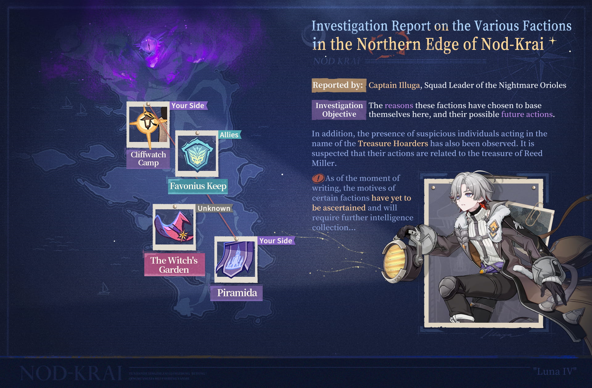 A la vanguardia de la región norte se encuentra una presencia desconocida para la mayoría de los jugadores que han viajado previamente por Espinadragón u otras áreas remotas. Aquí, los Caballeros de Favonius, tradicionalmente con sede en Mondstadt, han establecido una base. La aparición de estos caballeros sugiere un llamado a las armas más amplio contra las amenazas abismales y salvajes más allá de las fronteras de su nación, lo que implica que la influencia y la preocupación de Mondstadt ahora se extienden hasta el gélido norte. Es probable que los Caballeros estén involucrados en operaciones estratégicas o investigaciones relacionadas con las fuerzas antiguas que impregnan Nod-Krai, lo que refleja su papel expandido en los conflictos más grandes de Teyvat.