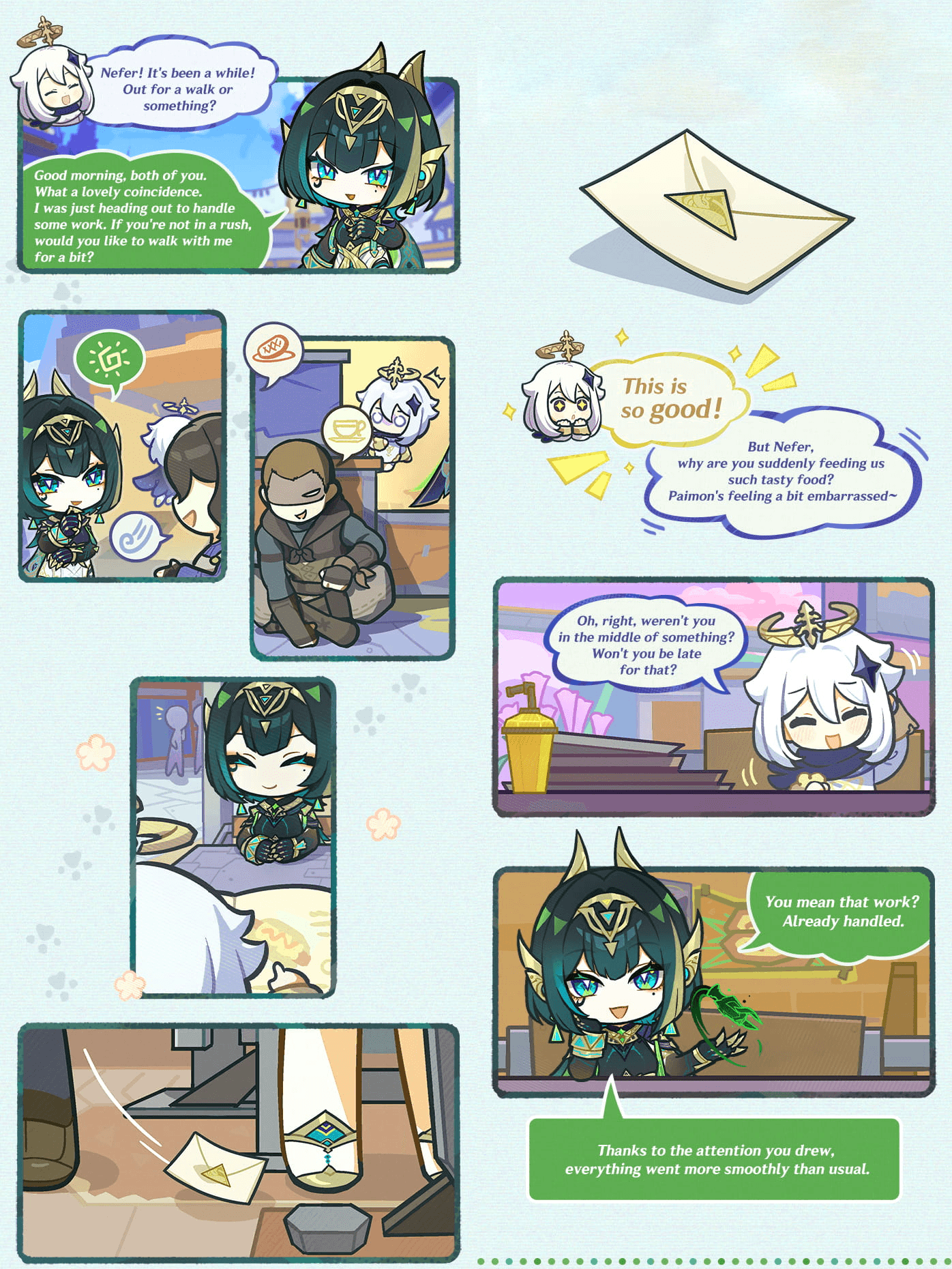 El cómic comienza en una mañana tranquila mientras el Viajero y Paimon pasean por las calles de Sumeru. Para su sorpresa, se encuentran con Nefer, quien los saluda con su elegancia habitual y un toque de calidez. “Buenos días a ambos. Qué agradable coincidencia,” dice ella, explicando que va de camino a ocuparse de un trabajo y los invita a unirse a ella. Este simple gesto establece el tono para un encuentro alegre y refrescante que combina el encanto cotidiano con la sutil intriga que rodea al personaje de Nefer.