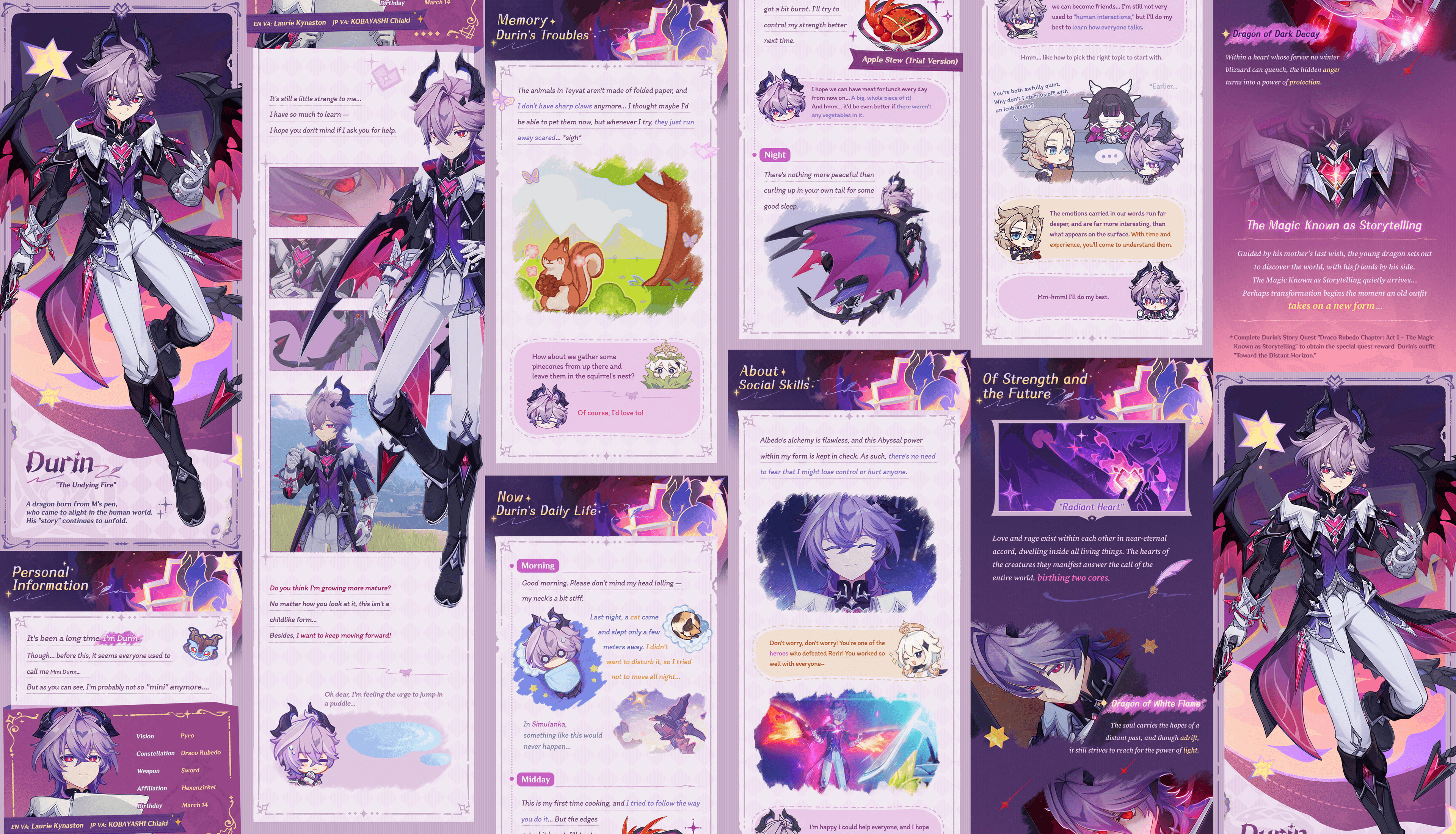 Visualmente, su diseño de personaje apoya esta doble identidad. Su atuendo combina una armadura cristalina afilada y motivos en forma de estrella con una elegante sastrería blanca y morada. Se siente parte caballero dragón, parte ídolo mágico, coincidiendo con su origen como criatura fantástica y su nueva vida entre humanos. El título “El Fuego Imperecedero” sugiere tanto su elemento Pyro como una determinación interna que el invierno, el miedo y la incomprensión no pueden extinguir. Ese fuego interno podría manifestarse como un fuerte soporte Pyro fuera del campo de batalla en el juego, mientras que el motivo del latido podría aparecer en animaciones, líneas de voz inactivas o efectos de ráfaga.