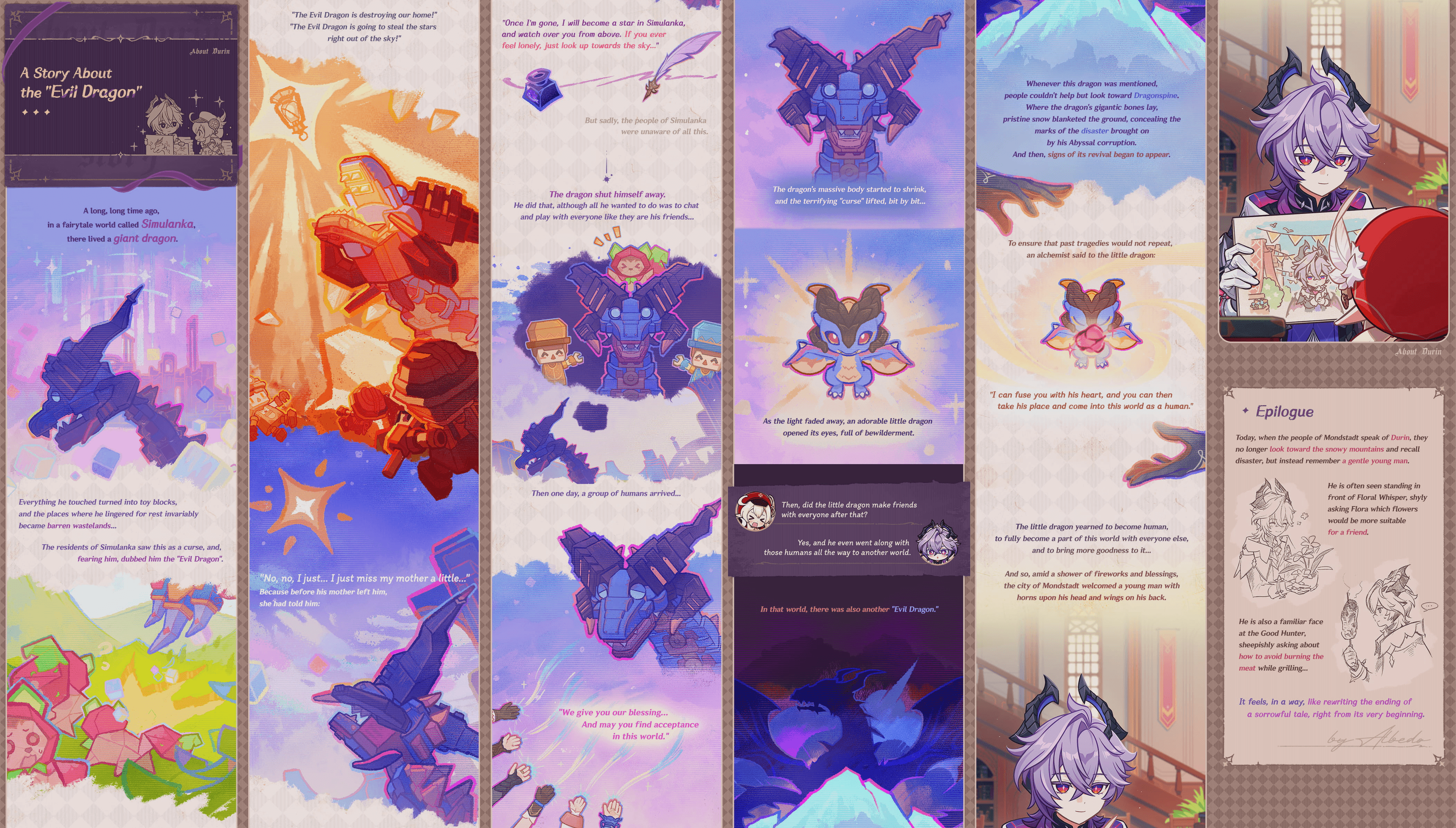 La última anécdota del personaje Durin en Genshin Impact, titulada “Una historia sobre el Dragón Malvado”, ha abierto una nueva ventana al pasado del misterioso dragón Pyro. Presentado como un libro ilustrado de un mundo de cuento de hadas llamado Simulanka, el relato describe a un dragón gigante cuyo poder transformaba todo lo que tocaba en coloridos bloques de juguete. Dondequiera que el dragón permanecía, las tierras exuberantes se convertían lentamente en páramos estériles parecidos a juguetes, aterrorizando a los residentes. Por miedo, lo llamaron el “Dragón Malvado.”