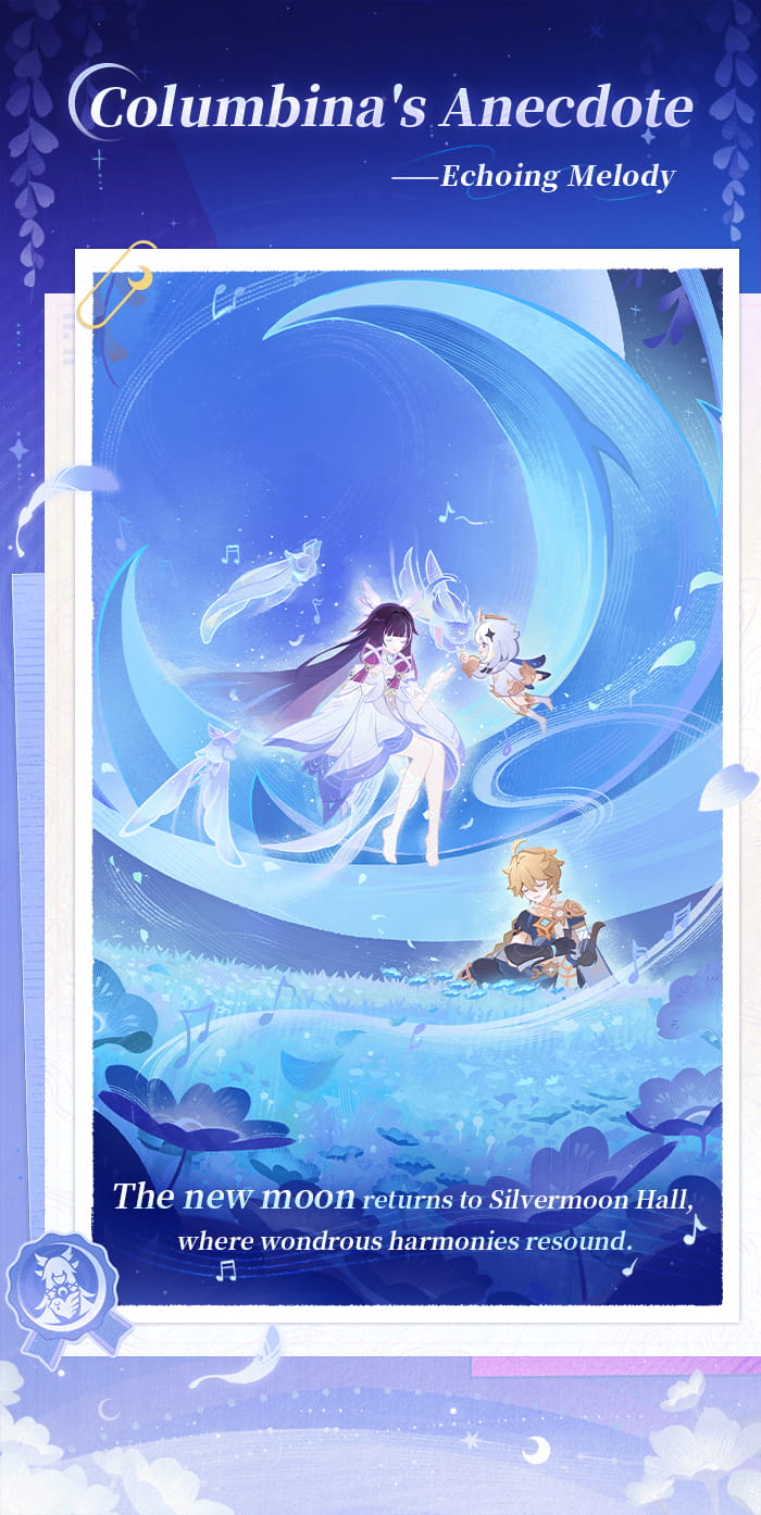 El propio Salón de la Luna Plateada funciona como un lugar importante en el viaje de Columbina, actuando como un espacio de reflexión y reencuentro. En momentos narrativos anteriores, Columbina deambulaba por el salón, atormentada por los ecos de su pasado y la incertidumbre de su futuro. Los jugadores que han recorrido las escenas de la misión del Salón de la Luna Plateada saben que estos momentos están cargados de resonancia emocional, a menudo marcados por música única, un ambiente de tenue luz de luna y elementos visuales simbólicos. El regreso de la luna a este lugar infunde al espacio una sensación de armonía, cierre y renovación, un motivo recurrente a lo largo de sus anécdotas y su narración de estilo diario.