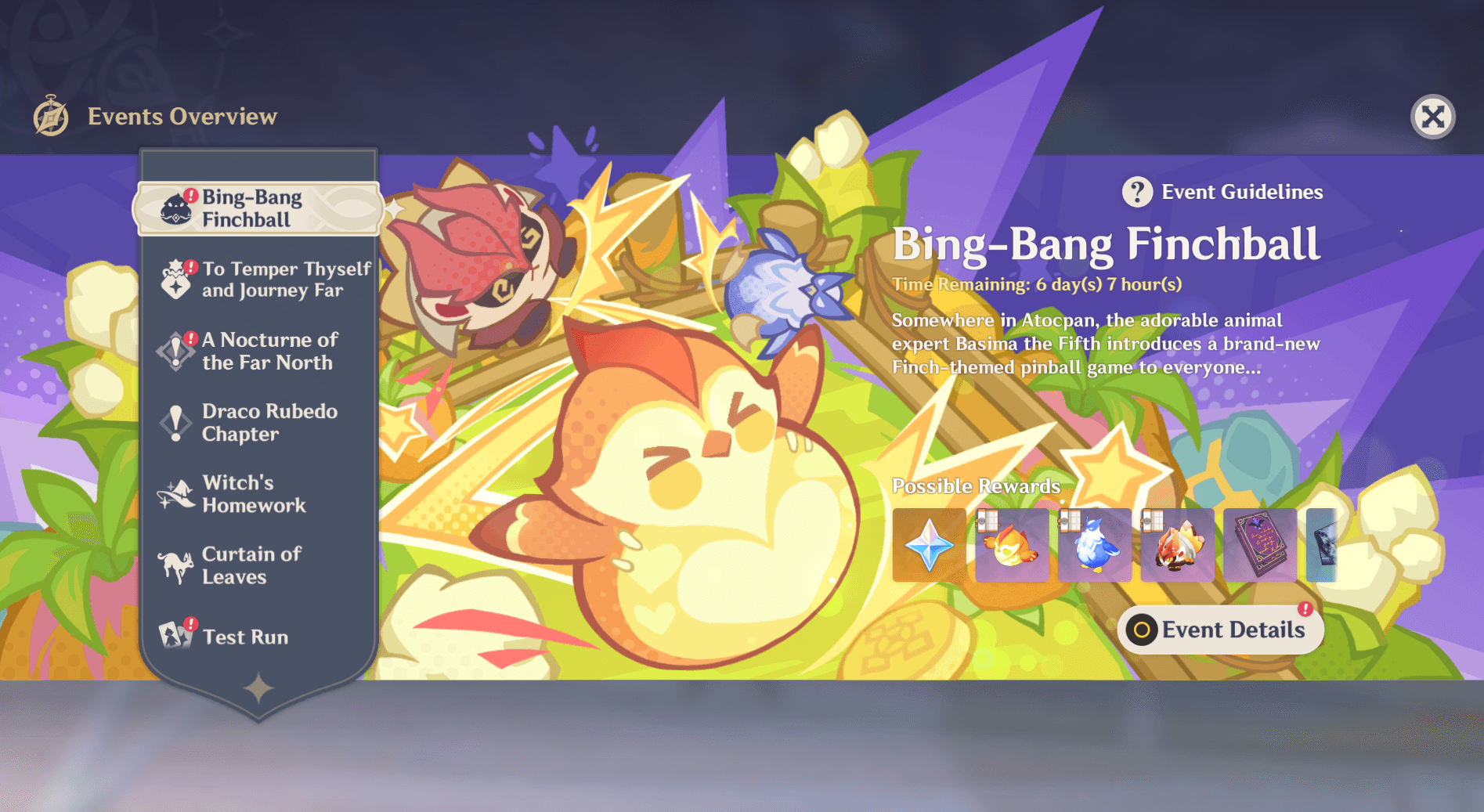 El evento temático de Natlan, actualmente activo en la versión 6.2, presenta Bing Bang Finchball, un colorido minijuego ambientado en Atocpan e introducido por Basima la Quinta, una experta en animales querida por su tono extravagante. El evento ofrece una experiencia de estilo pinball con temática de pinzones, apostando fuertemente por el encanto, los gráficos llamativos y una jugabilidad accesible. Muchos jugadores acogieron con agrado este cambio de ritmo, elogiando el evento por sus mecánicas relajantes, su adorable dirección artística y sus rápidas recompensas diarias. Recompensas como Protogemas, objetos exclusivos del evento y materiales de mejora se destacaron como un fuerte incentivo para la participación casual.