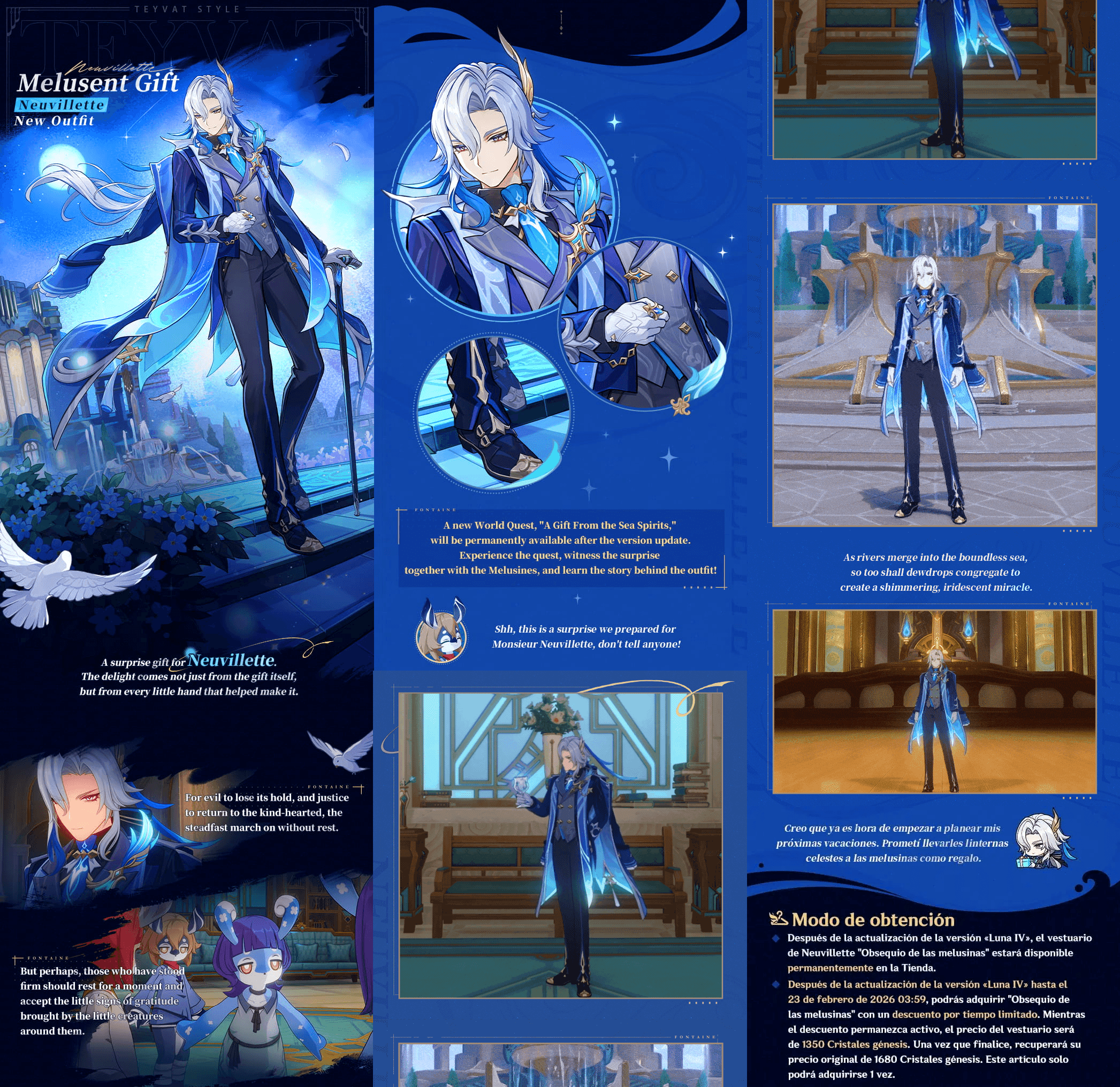 En cuanto al lore, el nombre Regalo de Melusina apunta directamente a la relación de Neuvillette con las Melusinas de Fontaine. El diseño refleja sutilmente gratitud, protección y respeto mutuo, temas que han sido centrales en el arco narrativo de Neuvillette. Esta conexión le da al atuendo un peso narrativo, haciendo que se sienta como una extensión significativa de su personaje en lugar de una adición puramente cosmética.
