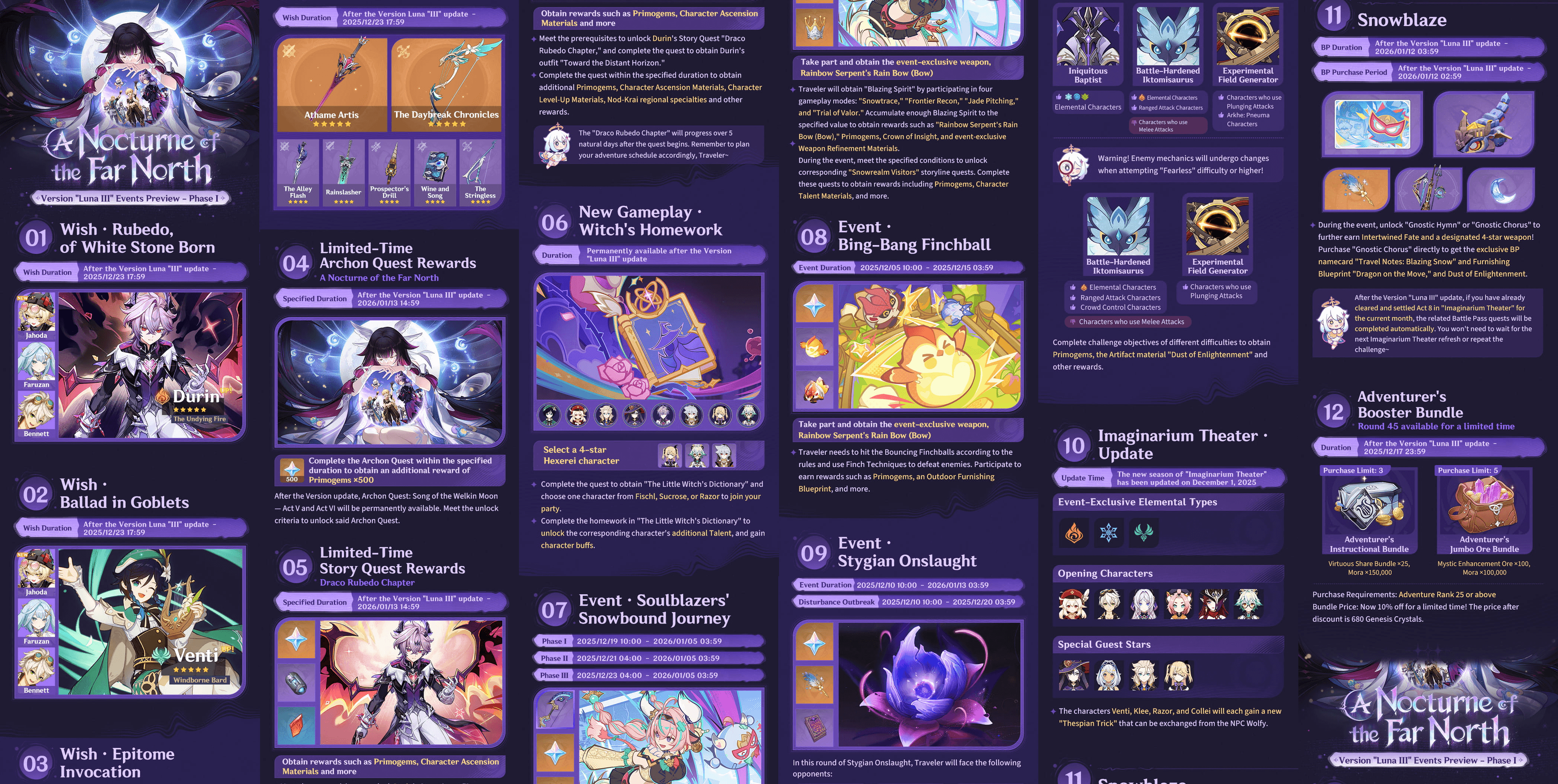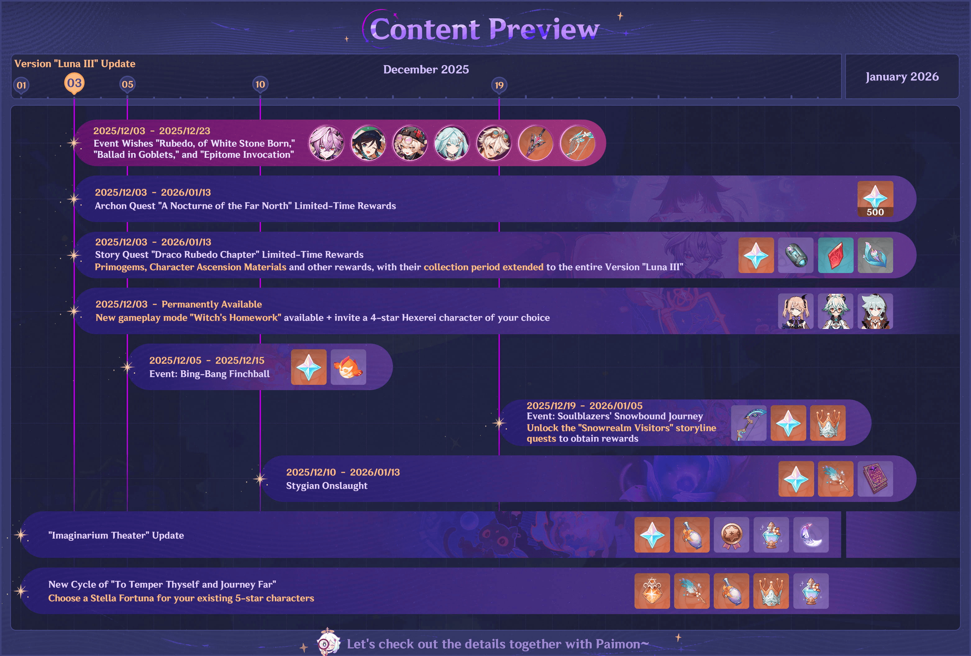 Bajo los avisos de la Versión “Luna III”, los Viajeros encontrarán detalles adicionales sobre eventos individuales. Estos avisos suelen desglosar las duraciones de los eventos, los modos de juego, las estructuras de recompensa y los requisitos de elegibilidad. La vista previa de la Fase I recomienda revisar estas páginas para mantenerse organizado, particularmente si desea optimizar la obtención de Protogemas o completar objetivos limitados del parche antes de que expiren. La inclusión de sistemas de larga duración como “Para Templarse y Viajar Lejos” significa que nuevos objetivos pueden desbloquearse gradualmente a lo largo del parche, animando a los jugadores a estar atentos al menú de eventos.